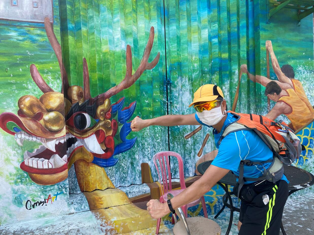 大澳壁畫近來成為打卡熱點,它亦成為打卡團的重要內容,教你如何拍出獨特角度。在大澳鄉事委員會廣場的橫水渡壁畫包含地畫,它既長且闊,要整幅拍下來兼人在橫水渡,這種個人照不夠特出,Ivan說可以嘗試拍攝分身壁畫,就是用手機的全景拍攝方法,這樣相片會出現兩三個的你站立在不同位置,很有趣。