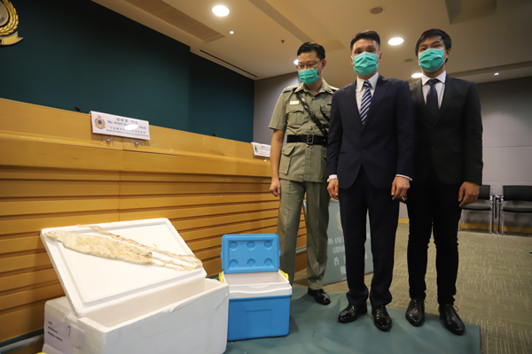左起:海關機場科空運貨物課監督劉青龍、海關有組織罪案調查科高級監督胡偉軍、漁農自然護理署瀕危物種保護主任陳翰奇。