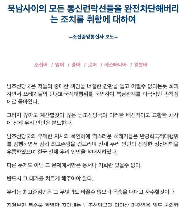会上得出的结论是,朝鲜不会再与韩国坐下来谈判,双方也没有任何问题可以探讨。全面关闭朝韩之间所有通信联络渠道是为彻底关闭与韩方的一切接触渠道、摒弃所有不必要之事采取的第一项行动。