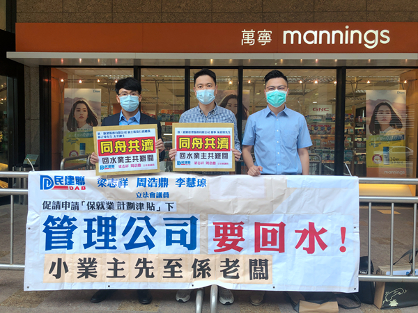 另一方面,民建聯元朗支部數名成員昨日到灣仔新鴻基中心外請願,民建聯立法會議員周浩鼎表示,政府推出「保就業」計劃,資助大廈管理公司、清潔、保安公司僱主出糧,但卻沒有保障小業主權益。