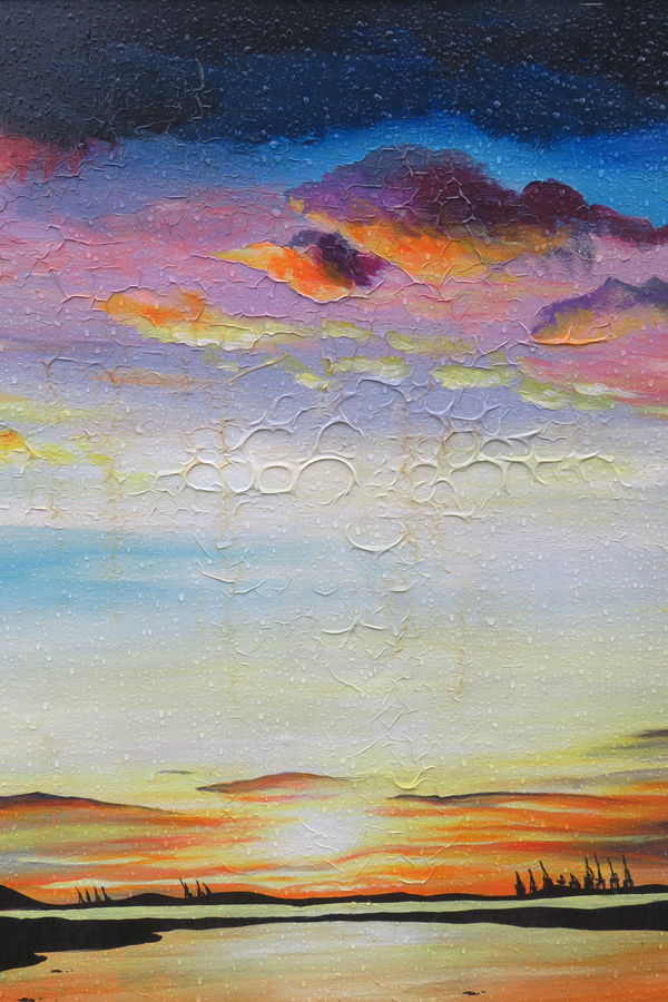 掛畫所用畫板為被棄置的隔熱板,有瑕疵照用,結果產生「日落奇景」。
