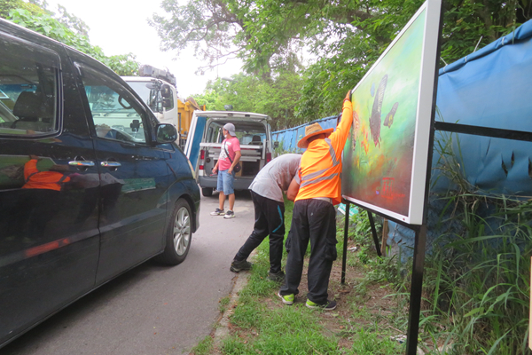 17幅掛畫中,有4幅懸掛在通往鴨仔坑泥灘的小路,一幅在鴨仔坑士多,另外12幅懸掛在往下白泥方向的稔灣路,路程約3公里。村民孻叔、彬仔及細粒唐義務運畫往各懸掛點,之後在已準備好的支架上將畫用螺絲鑲實。約1小時的掛畫期間,屬單程路的稔灣路車來車往,亦下起雨來,但他們仍按序及落力地去完成,希望行山客及駕駛人士可盡快看到下白泥的大自然掛畫。