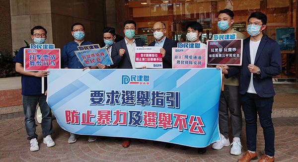 民建聯敦促特區政府必須確保立法會選舉不要被「黑暴」及「攬炒」勢力所騎劫。民建聯副秘書長顏汶羽、青年民建聯主席施永泰等,昨日到選舉管理委員會請願,要求選舉指引防止暴力及選舉不公。他們對於去年11月區議會選舉充斥「黑暴」及不公,更破紀錄接獲4.5萬宗投訴,認為實在令社會各界震驚。他們期望選管會主席馮驊能認清現今「黑暴」及「攬炒」的政治形勢,虛心聽取民意,體恤及關顧長者選民的需要,積極回應市民的強烈訴求,在即將公布的「立法會選舉活動指引」的改善措施當中,必須包括採用電子派票、設立「關愛隊」方便長者投票,以及授權廉署人員派駐投票站內,維護選舉公平。此外,他們也期望選管會必須認真履行法定職能,堵塞選舉指引的漏洞,保障候選人和選民應有的權利和安全,以及確保選舉在安全及公平公正下舉行。