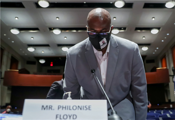 遭警察「跪頸致死」的美國黑人男子弗洛伊德的遺體在6月9日下葬後,其胞弟菲洛尼斯10日到國會作供,呼籲國會通過改革警察制度法案。