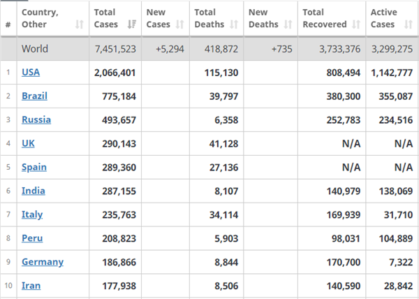 Worldometers發佈的疫情數據顯示,截至香港時間11日9時左右,全球累計確診超745萬例,累計死亡近42萬例;其中,美國累計確診已超200萬例,累計死亡超11萬例。