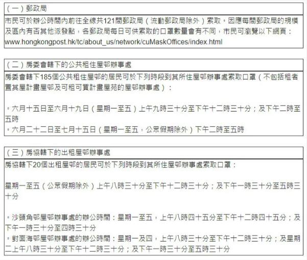 局方強調,郵政局或屋邨辦事處的電腦或手提裝置不會儲存市民的身分證號碼及其他個人資料。如市民無法親身前往索取口罩,可於7月6日至15日期間授權他人在郵政局及屋邨辦事處代領。詳細安排於7月初公布。房委會及房協轄下屋邨辦事處亦會透過預約安排分發口罩予有特別需要的租戶(如長者或行動不便的人士)。索取地點: