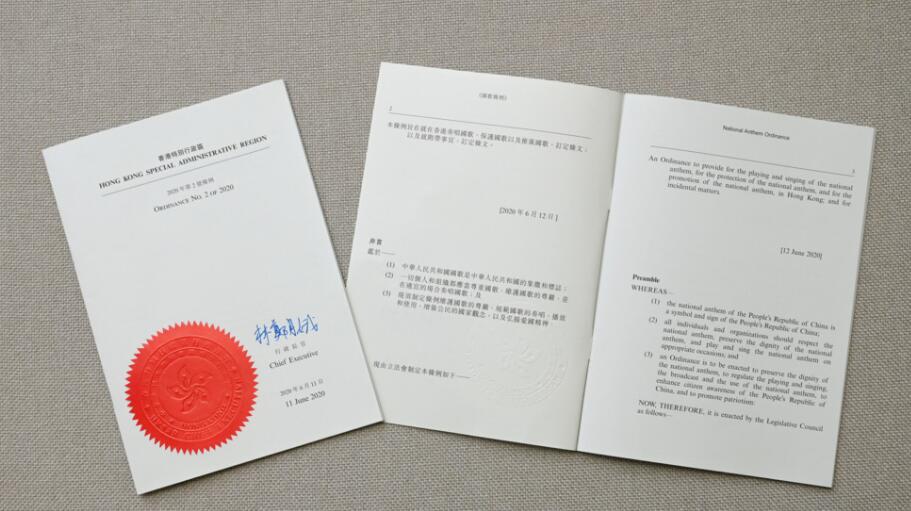 《国歌条例》为奏唱、保护及推广国歌订定条文,以维护国家的尊严,增强公民的国家观念,以及弘扬爱国精神。《国歌条例》所订明的罪行只涉及不当使用国歌,或公开、故意、意图侮辱国歌的行为。《国歌条例草案》在2019年1月提交立法会首读和二读,并在本月4日在立法会三读通过。