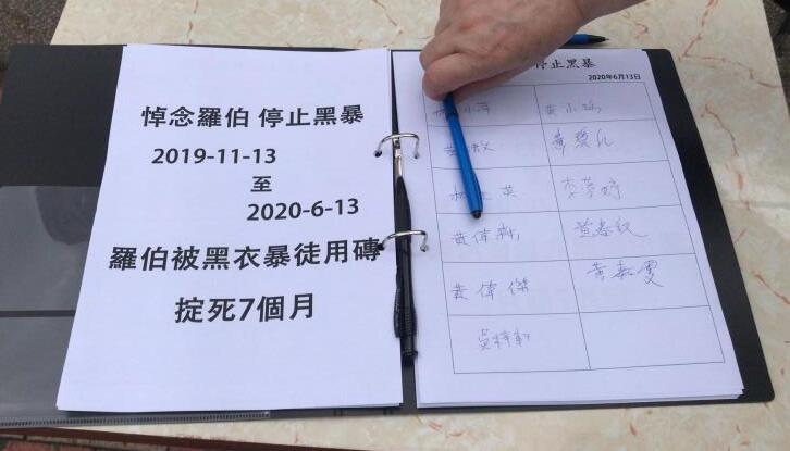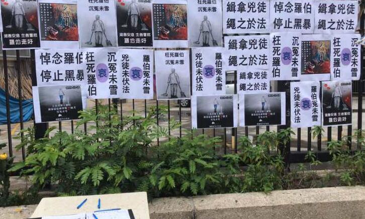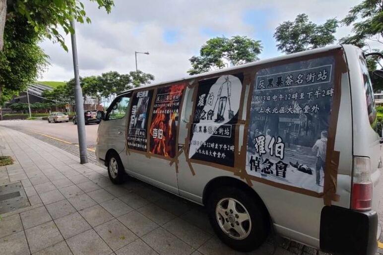 今早,有一辆张贴海报内容为反对黑暴,呼吁市民悼念罗伯和支持被火烧伤李伯的流动宣传车,途径港岛奥运大楼、金钟金融街、政总立法会,九龙旺角警署、尖沙咀,新界马鞍山,新界上水大会堂等地,呼吁市民于13日中午前往上水北区大会堂,马鞍山海柏花园天桥参与反黑暴街站签名活动,悼念罗伯并祝愿被暴徒点火烧伤的李伯早日康复。