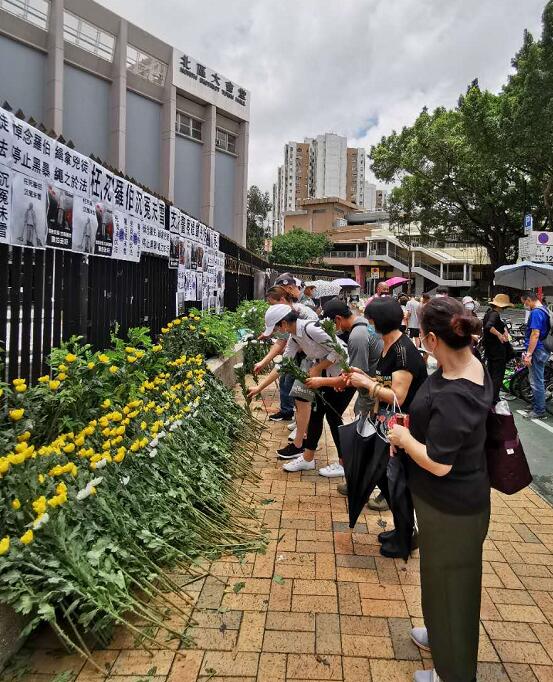 【香港商报网讯】去年11月13日,70岁的清洁工「罗伯」,于上水北区大会堂附近示威现场,遭砖头击中头部送院后翌日身亡。今日,北区大会堂门外,有市民发起「悼念罗伯」活动并分批陆续献上鲜花。