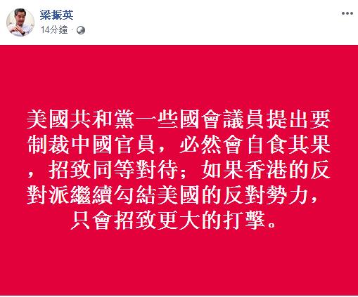 昨晚,前特首梁振英在社交媒体发文指,美國共和黨一些國會議員提出要制裁中國官員,必然會自食其果,招致同等對待;如果香港的反對派繼續勾結美國的反對勢力,只會招致更大的打擊。
