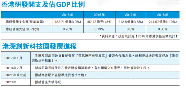 近年,港府已投放逾千億元推動創科發展,但香港本地研發開支佔本地生產總值(GDP)佔比仍然偏低。根據去年底公布的《2018年香港創新活動統計》報告,本地研發開支僅佔GDP的0.86%;而在內地其他省市,例如廣東佔比達2.78%,福建1.8%,河北1.39%,上海和北京更高達4.16%及6.17%。故此,行政長官林鄭月娥早在2017年施政報告就定下目標,要在2022年本屆政府任期屆滿前,將本地研發開支佔GDP的佔比提升至1.5%。