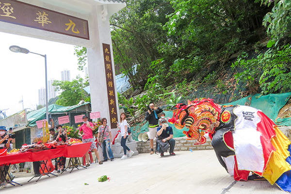 90歲的曾良,是其中一名為石獅子開光的村民,他頂猛烈陽光,小心翼翼地在風水師傅指引下完成。曾良說,家族在九華徑村至今已四五代,他在村出世,長大後搬往大埔居住,最少五六十年無住過祖居。然兒時記憶仍深印腦海,「舊時左邊全部都係海(未填海前村前是荔枝角灣),呢邊係田,山有羊仔、狐狸、箭豬……,十幾歲時見過黃永玉,同佢打招呼,堂細佬跟佢學過畫,我就無興趣喇!」他說,村裏從來未起過這麼漂亮的牌坊,落成是大件事,一定要回來參與。這天他偕同太太、兩名做醫生的兒子曾華德及曾華廣、一名兒媳出席盛會,女兒即藝員曾華倩則未有赴會。