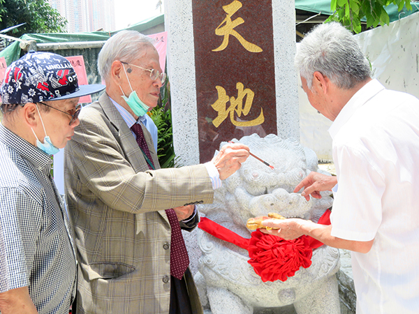 年屆90歲的村民曾良,為石獅子開光。
