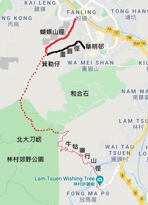 牛牯嶺行山徑終點處約高360米,接入林村郊野公園。這時兩邊高樹形成的林蔭清涼,泥土山徑走來舒暢。約走20分鐘見三岔路口,前路兩方分往粉嶺車站及白牛石經大刀屻。從這裏開始往粉嶺車站基本上是下坡路,大約向前走半小時,即由泥路山徑進入石屎路,一路向下走約10分鐘,便到達設於蝴蝶山頂至箕勒仔一帶的觀景台,這裏約高200多米,可眺望北區景色,上水、文錦渡、塱原,粉嶺高爾夫球場等盡入眼簾,若天氣良好,可遠望至深圳羅湖。
