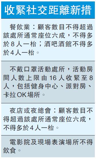鑒於本港疫情近日出現急劇變化,港府昨就《預防及控制疾病(規定及指示)(業務及處所)規例》(第599F章)下指示刊憲,收緊社交距離措施。食衛局局長陳肇始表示,因應出現本地源頭不明個案,特區政府要快速應對,適時收緊措施。她指,隨着日前公布的口岸措施以外,餐飲、表列處所等場所須有新上限限制,並於昨日刊憲,由2020年7月11日凌晨生效,為期14日。其中,從11日凌晨起,餐廳上座人數不得超過常設座位的六成,餐廳每枱不得多於8人,酒吧、夜店、夜總會不可多於4人同枱。健身中心、卡拉OK及派對房間人數由16人收緊至8人;電影院及公眾娛樂場所不得飲食。