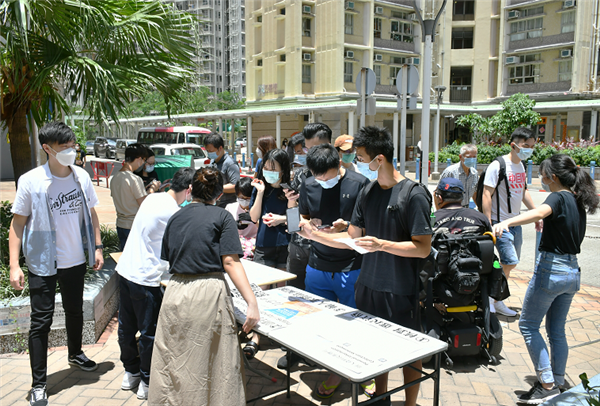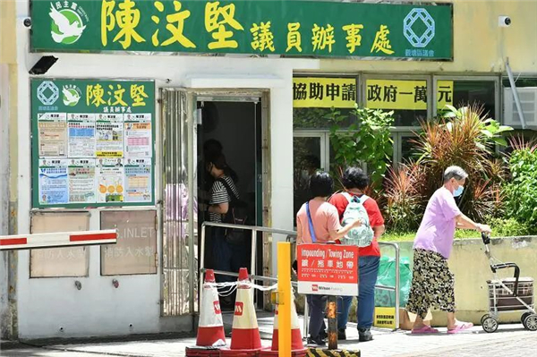 在观塘油丽邨也有一个投票站,设于区议员办事处门口空地,有市民前来投票,多为年轻人。(记者 冯瀚文摄)