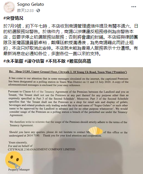 其中一家早前宣称会用作揽炒派「初选」票站的「黄店」Sogno Gelato昨日(10日)也在facebook发帖宣布,取消作为票站的安排。
