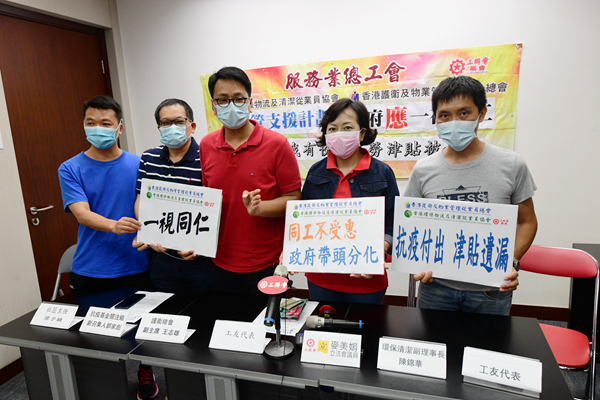 香港護衛及物業管理從業員總會、香港環保物流及清潔從業員協會昨反映部分員工未獲發津貼情況。記者崔俊良攝