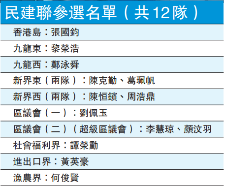 其中李慧琼將聯同顏汶羽,合組名單出選超級區議會。地區直選方面,周浩鼎和陳恒鑌出選新界西;鄭泳舜出選九龍西;黎榮浩出選九龍東;葛珮帆、陳克勤出選新界東;張國鈞出選港島區。而傳統功能組別方面,漁農界何俊賢將競逐連任;中華出入口商會副會長黃英豪出選進出口界;深水埗區議員劉佩玉出選區議會(第一)界別;譚榮勳出選社福界。