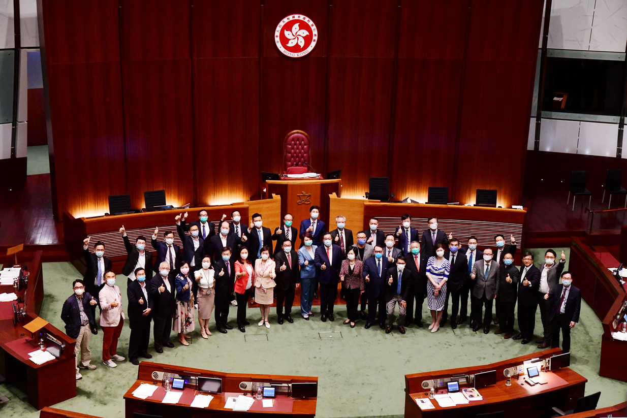 今屆立法會昨晚舉行最後一次大會,建制派議員和立法會主席梁君彥合影。記者崔俊良攝
