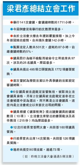 梁君彥昨日總結第6屆立法會的情況。他形容今屆立法會出現許多前所未有的問題及挑戰,今屆初便有6位議員被法庭裁定宣誓無效,被取消議員資格。此外,有2位議員被法庭裁定並非在立法會補選中妥為選出,因此不再是立法會議員。這些均是立法會成立以來首次出現的情況。
