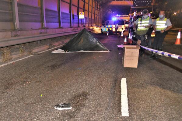 追截兇徒男子遭車撞分屍,屍體分別由兩個綠色帳篷暫時遮蓋,警方人員到場調查蒐證。