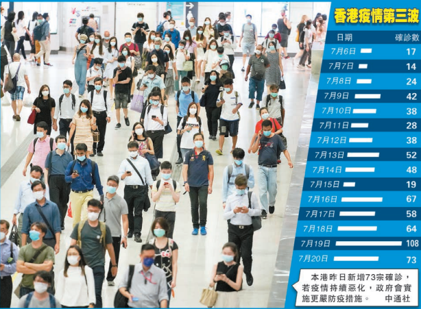 【香港商報网訊】記者何加祺報道:本港疫情仍未受控,至昨凌晨零點再新增73宗確診個案,當中本地個案66宗、海外輸入7宗,累計已達1958宗。在本地個案中,有39宗與之前群組相關,其餘27宗則源頭不明。衛生署衛生防護中心傳染病處主任張竹君表示,政府是否須實施「禁足令」要視乎疫情趨勢,如果個案以倍數上升或以幾何級數增加,疫情再惡化就會實施更嚴厲措施,外國亦有實施同類措施,但不希望香港需要。