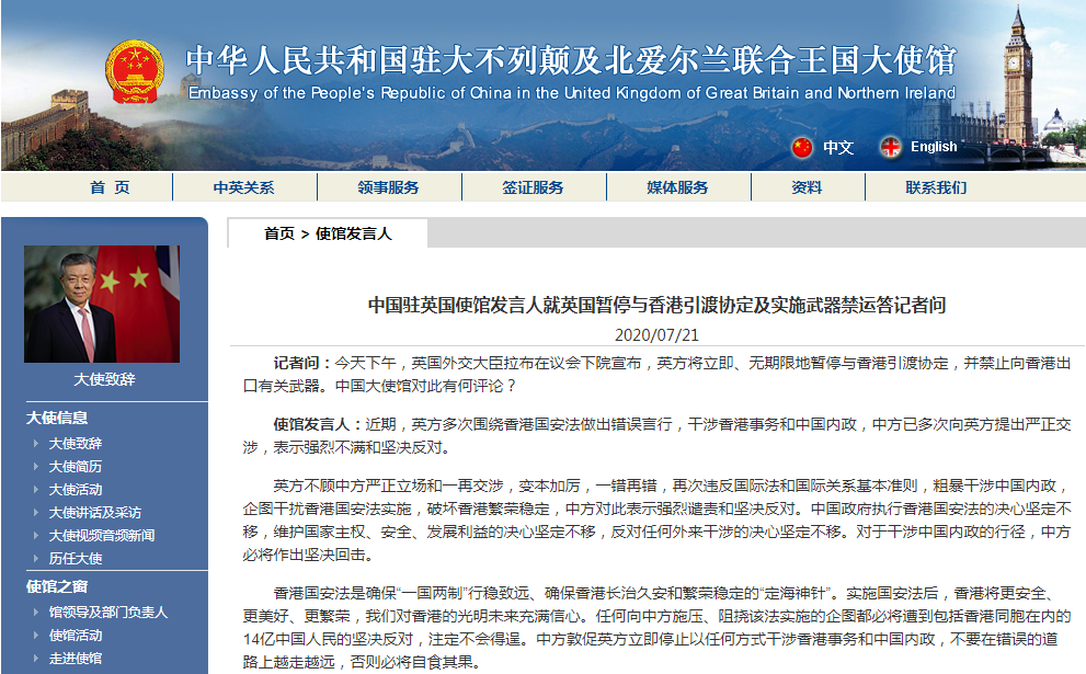 據中國駐英國大使館官網7月21日淩晨消息,中國駐英國使館發言人就英國暫停與香港引渡協定及實施武器禁運答記者問。