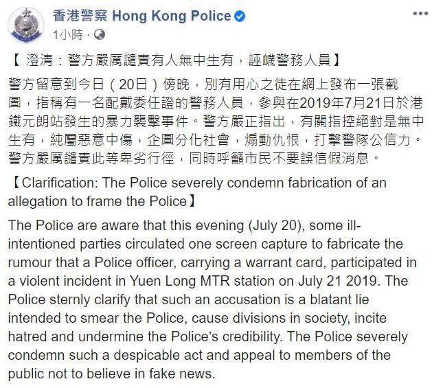 【香港商报網訊】20日晚,香港警方於社交網絡發文表示,留意到別有用心之徒在網上發布一張截圖,指稱有一名配戴委任證的警務人員,參與在2019年7月21日於港鐵元朗站發生的暴力襲擊事件。警方嚴正指出,有關指控絕對是無中生有,純屬惡意中傷,企圖分化社會,煽動仇恨,打擊警隊公信力。