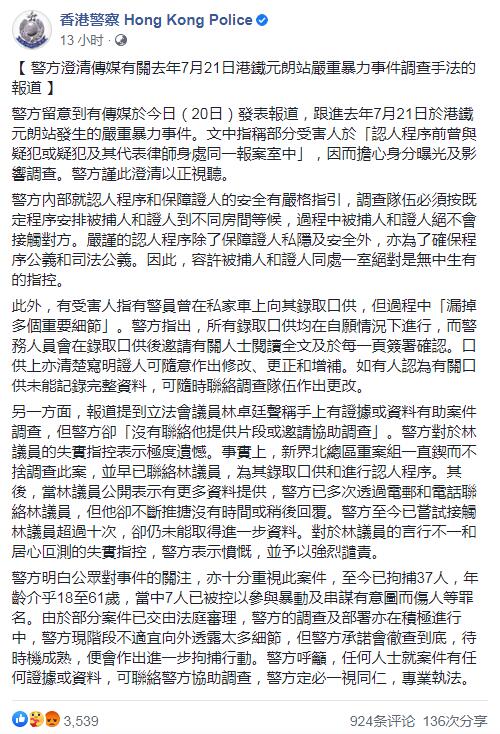 另外,有報道提到立法會議員林卓廷聲稱手上有證據或資料有助案件調查,但警方卻「沒有聯絡他提供片段或邀請協助調查」。警方回应指,林卓廷的指控失實,并表示極度遺憾。