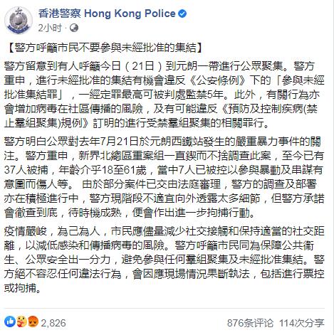 【香港商报网讯】今日是7·21事件一周年,有「示威者」呼籲在元朗一個商場聚集。警方表示,留意到有人呼籲今日到元朗一帶進行未經批准的集結。警方重申,進行未經批准的集結有機會違反《公安條例》下的「參與未經批准集結罪」,一經定罪最高可被判處監禁5年。此外,有關行為亦會增加病毒在社區傳播的風險及有可能違反《預防及控制疾病(禁止羣組聚集)規例》訂明的進行受禁群組聚集的相關罪行。
