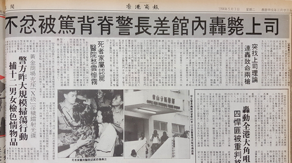 1994 年5 月3 日的香港商報,報道了總督察梁子龍被槍擊斃命案件。