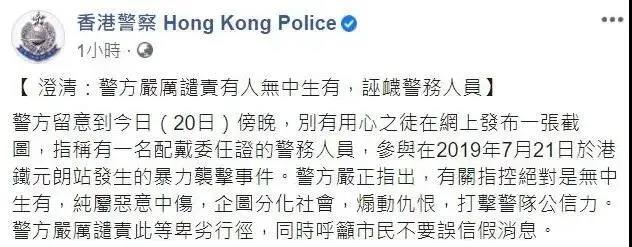 【香港商报网讯】记者木子报道:昨晚,香港警方于社交网络发文表示,留意到别有用心之徒在网上发布一张截图,指称有一名配戴委任证的警务人员,参与在2019年7月21日于港铁元朗站发生的暴力袭击事件。