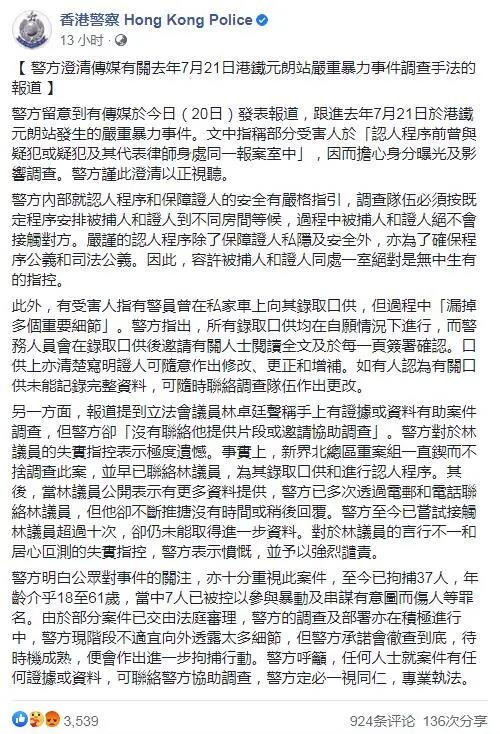 另外,有报道提到立法会议员林卓廷声称手上有证据或资料有助案件调查,但警方却「没有联络他提供片段或邀请协助调查」。警方回应指,林卓廷的指控失实,并表示极度遗憾。