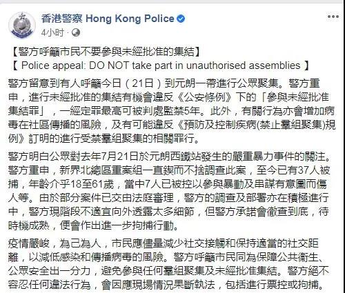 此外,警方今日在社交网站专页指,留意到有人呼吁今日到元朗一带进行公众聚集。警方重申,进行未经批准的集结有机会违反《公安条例》下的「参与未经批准集结罪」,一经定罪最高可被判处监禁5年。