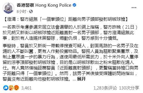 警方稱,一名考慮參選立法會的人誣蔑警員「近距離直射頭部」,更聲稱當時槍口與男子距離只得「一個拳頭位」。然而,該男子其後接受媒體訪問時指出,警員沒有近距離向他發射胡椒球槍。