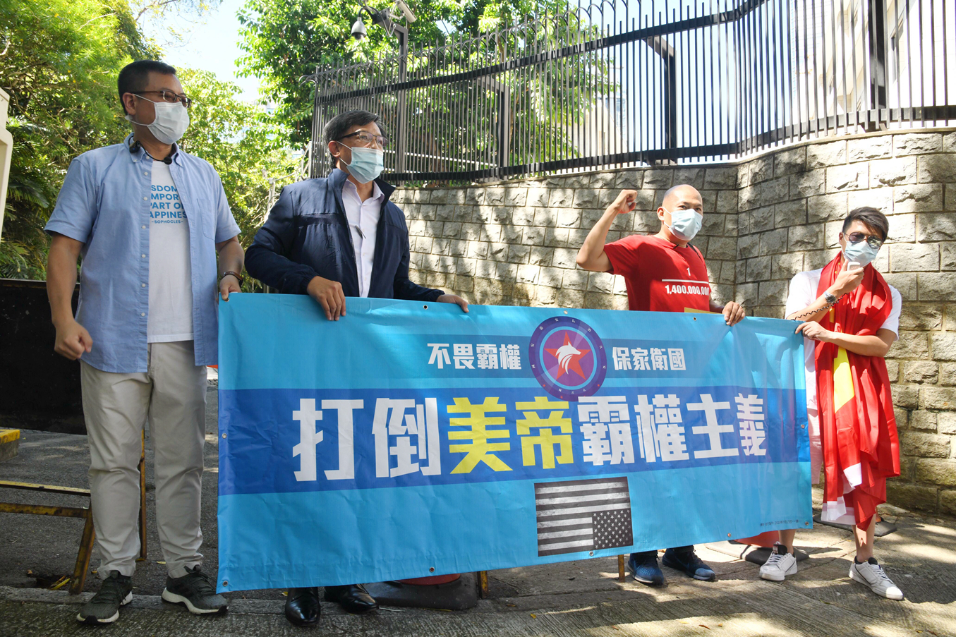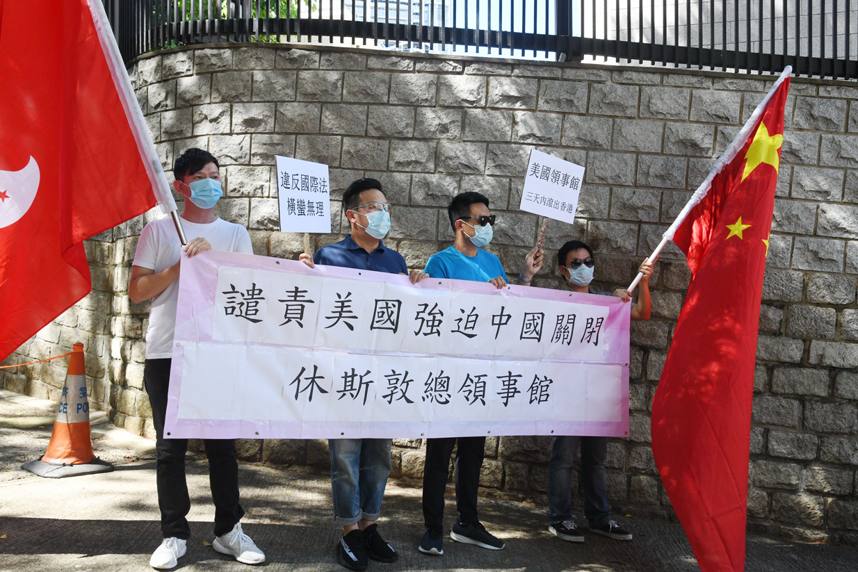【香港商報网訊】記者萬家成報道:美國政府突然要求中方在72小時內關閉中國駐美國休斯頓總領館,惹起香港各界市民憤怒,昨日最少有4個團體到美國駐港澳總領事館門外示威抗議。有請願人士要求中國政府以其人之道還施彼身,關閉美國駐港澳總領事館。其中,到場請願的立法會議員何君堯指,美國的行為近乎斷交,不符合中美人民利益。