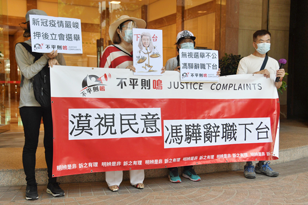另一個示威團體「公平選舉關注組」發言人黃引祥表示,防疫比選舉更重要,距離9月選舉不到2個月,就算政府「急就章」依時選舉,仍有數十萬港人在內地長期居住與工作,這一大批港人因此未能返港投票,加上長者可能因疫情不能外出投票,會造成選舉不公。