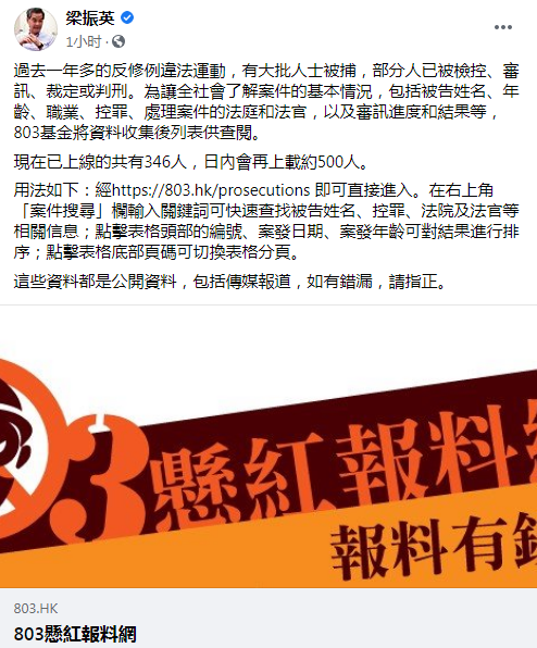 梁振英表示,「過去一年多的反修例違法運動,有大批人士被捕,部分人已被檢控、審訊、裁定或判刑。爲讓全社會瞭解案件的基本情况,包括被告姓名、年齡、職業、控罪、處理案件的法庭和法官,以及審訊進度和結果等,803基金將資料收集後列表供查閱。」