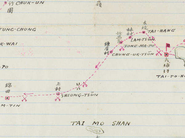 六日戰爭的關鍵人物時任輔政司駱克,其珍藏中有親手繪的平定新界村民衝突路線圖(局部),交叉符號為發生衝突的位置,可見在大埔墟至錦田之間有多場打鬥。香港歷史博物館提供圖片