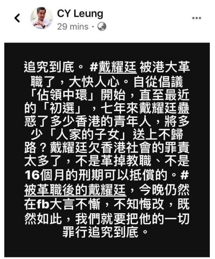 梁振英说:「戴耀廷被港大革職了,大快人心。自從倡議『占領』中環開始,直至最近的『初選』,七年來戴耀廷蠱惑了多少香港的青年人,將多少『人家的子女』送上不歸路?戴耀廷欠香港社會的罪責太多了,不是革掉教職、不是16個月的刑期可以抵償的。被革職後的戴耀廷,仍在臉書大言不慚,不知悔改,既然如此,我們就要把他的一切罪行追究到底。」