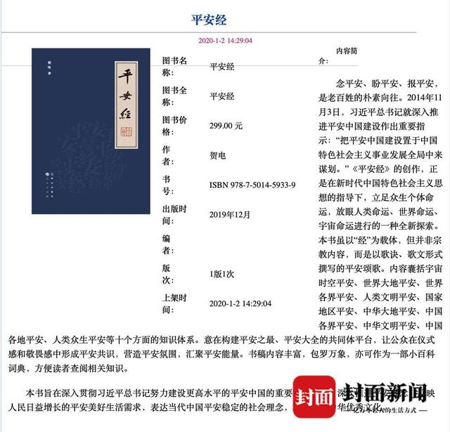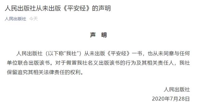 至于被指联合出版此书的人民出版社,28日下午4点半,人民出版社在官方微信发布声明,称从未出版《平安经》一书,也从未同意与任何单位联合出版该书。对于假冒出版社名义出版该书的行为及其相关责任人,人民出版社保留追究其相关法律责任的权利。