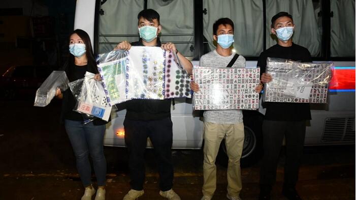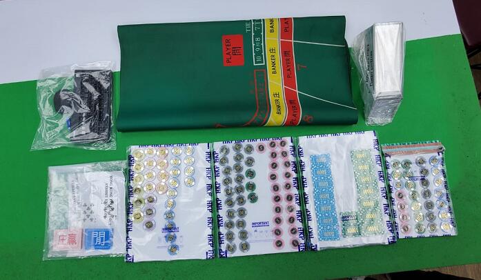警員於兩個單位內共檢獲一張百家樂枱、5副撲克牌、3部電視、6張電動麻雀枱、12副麻雀、約45.3万元現金及約18.3万元籌碼。
