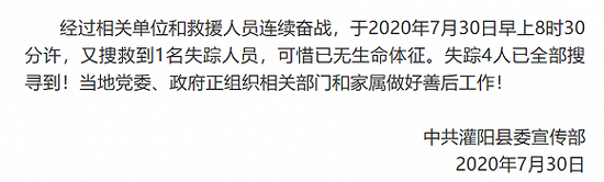 据今日灌阳微信消息,7月30日早上6时40分许,又捜救到1名失踪人员,已无生命体征。8时30分许,又捜救到1名失踪人员,已无生命体征。失踪4人已全部搜寻到。
