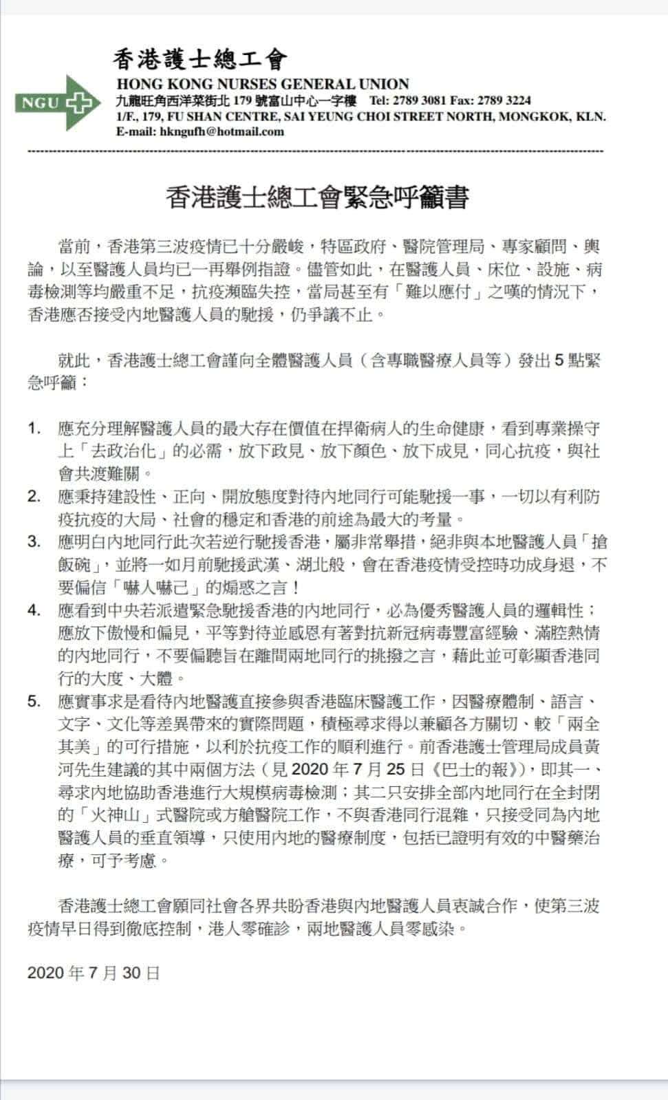 護士總工會指香港在應付第三波疫情上瀕臨失控,無論醫護人員、床位、設施、病毒檢測等都面對嚴重不足的問題,認爲醫護人員應理解其存在價值是捍衛病人的生命健康,必需謹守專業操守“去政治化”,持建設性、正向、開放態度對待內地同行可能馳援一事。又指希望全體醫護以防疫抗疫的大局、社會的穩定和香港的前途爲最大考量,平等對待幷感恩有著對抗新冠病毒豐富經驗的內地同行。工會希望醫護明白此次內地同行若馳援香港屬非常舉措,絕非與本地醫護人員“搶飯碗”,幷會如馳援湖北武漢般在香港疫情受控之時功成身退。