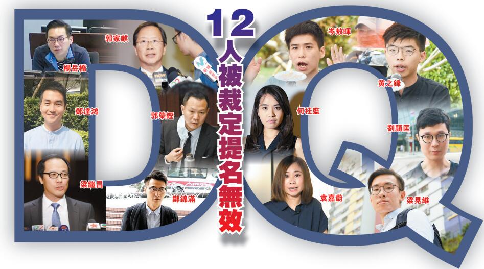 被取消資格(DQ)的包括公民黨4名參選人,即參選新界東的該黨黨魁楊岳橋、參選新界西的郭家麒、參選香港島的鄭達鴻、參選法律界的郭榮鏗。其他被DQ的還有:參選區議會(第二)界別的岑敖暉;參選香港島的袁嘉蔚、梁晃維、熱血公民名單排名第二的鄭錦滿;參選新界東的劉颖匡、何桂藍;參選九龍東的黃之鋒;以及參選會計界的專業議政梁繼昌。
