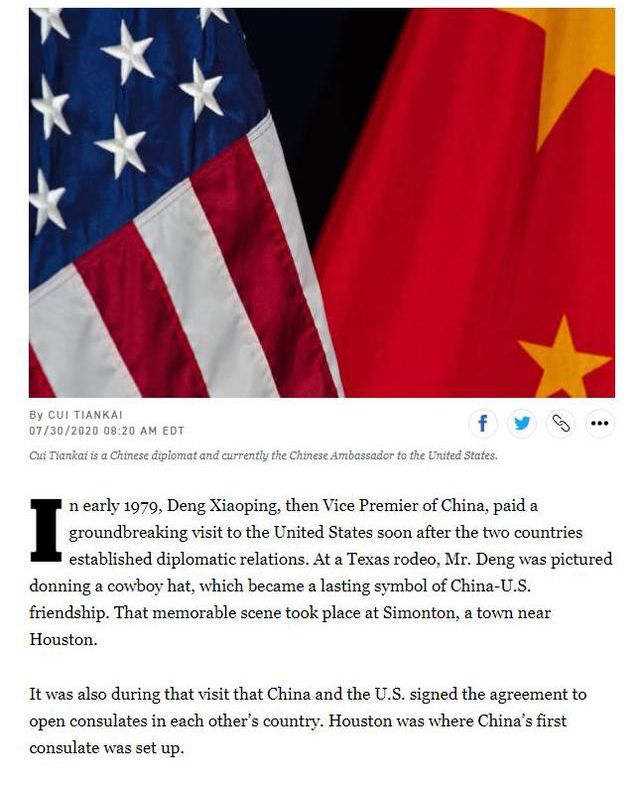 文章强调,中国的对美政策没有变化。本周中方根据对等原则要求美方关闭驻成都总领馆,仅是对美方关闭中国驻休斯敦总领馆的正当和必要反应,符合外交惯例,也是主权国家的应有权利。我们仍愿本着善意和诚意发展中美关係,希望美方能重回中美关係发展的正轨。