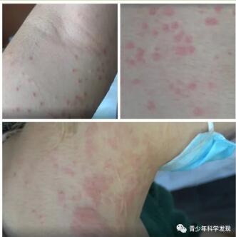起初我们还以为是夜晚被蚊虫叮咬所致,但红疹范围遍布全身:手臂,双腿甚至是脖颈和肚子上都出现了大片红疹,使我们确定这不是简单的蚊虫叮咬。