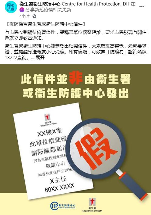 另外,衞生防護中心下午亦在社交媒體專頁發文,提醒市民提防僞冒衞生署或衞生防護中心信件,中心在帖文中表示,有市民收到騙徒僞冒信件,聲稱某單位懷疑確診,要求市民發現有關住戶就立即致電通知。衞生署或衞生防護中心幷無發出相關信件,市民應提高警覺,「最緊要求證,幷提醒身邊親友小心受騙」。如有懷疑,可致電「防騙易」諮詢熱綫18222查詢。