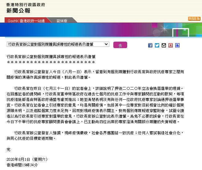 行政長官在昨日的記者會上,詳細說明了押後今年立法會換屆選舉的理據。在回應記者的提問時,行政長官重申特區政府在過去7個月的抗疫工作中與專家顧問的互動和默契,每項抗疫措施都是由特區政府通盤考慮而推出;她並清楚表明沒有與任何一位政府抗疫專家討論過押後選舉事宜。行政長官在記者會上引述專家的意見,均是有關疫情,包括其中一位專家對目前相當比例的確診個案源頭未明,以及追蹤個案力度未足夠,因而對現時疫情表示關注。對有個別傳媒報道穿鑿附會,試圖令讀者以為行政長官引述專家對選舉的意見,行政長官辦公室對此表示遺憾。為免不必要的誤會,行政長官在今日下午舉行的抗疫專家顧問委員會會議上,已主動向4位出席的專家澄清有關部分媒體的失實報道。